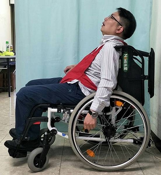 【我很沒用 ! 坐在輪椅上只要幾分鐘就累了,一累坐輪椅就開始往前滑,每次都要志明幫我施展乾坤大挪移神功 ! ,我真的很沒用、很不好意思...】 你聽了很納悶,天啊 ! 怎麼會這樣哩???